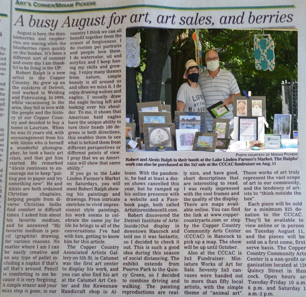 Covid-19 update: shows were cancelled, however I have been very busy with commissioned work. Thank you one and all! I would like to thank Jen B. of Calumet MI, Jim & Laura H. of Bootjack MI, Cheri H. of Citrus Hills FL, Dave G. of Calumet MI, John F. of TN. & various others. It has been fun drawing everything from beloved pets, historic buildings, family homes, favorite vacation sites and I having even started doing portraits of loved ones. You have all helped stretch me as an artist, thank you. I have enjoyed getting to know all you and hear the memories behind the images.